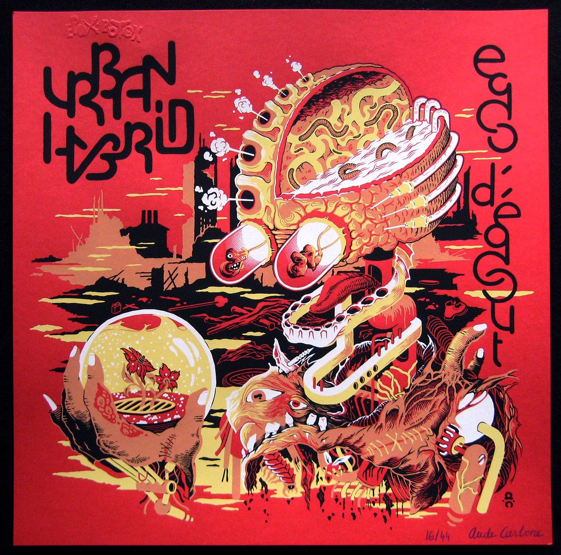 Living in 2153 has this benefit : one can only revel in the sound produced by the resonance of an amplified neosteel made cranial cavity or the freak vibrations that leak out of a recycled plastic cyber oesophagus. Urban Hybrid is a band who knows how to play their members’appendages and the reverse. Not satisfied with the gain they made of their genetic mutations -still suffered as a handicap among human beings some decades ago- nor with the hijacking of the recent nanotech progresses that allowed them to transform their bodies into instruments, their lyrics play with words and strike every time. Cynical state of play, without concession and paradoxically without sadness, of a dying era, of a race that doesn’t want to live anymore but doen’t get to expire. A seamless crescendo from the first to the last minute, on a very very rare synthetic vinyl. To listen without delay.